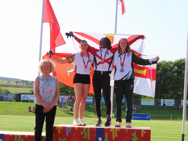 A brilliant bronze for Vicky Hancock in the triple jump, setting a pb and a new island record on day one of her week. The Bailiff and Chris Jackson, our GIGA Secretary, were there cheering her on.